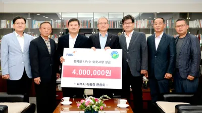 파주시 이·통장연합회, 이웃돕기 성금 기탁 파주시 이·통장연합회(회장 황유성)는 8일 오전 추석 명절을 맞아 17개 읍면동협의회에서 마련한 이웃돕기 성금 400만원을 파주시에 전달했다. 독거노인이나 소년소녀가장 등 도움이 필요한 분들에게 보탬이 되고 싶다는 각 ...