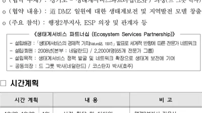 경기도, ESP아시아사무소 유치‥DMZ생태자원 보전에 맞손 - 경기도·ESP, 23일 북부청사서 DMZ 일원 보전을 위한 업무협약 체결 <주요 내용>○ 도, 9월 23일 생태계서비스파트너십(ESP)과 업무협약 체결 - DMZ생태관광지원센터에 ESP 아시...