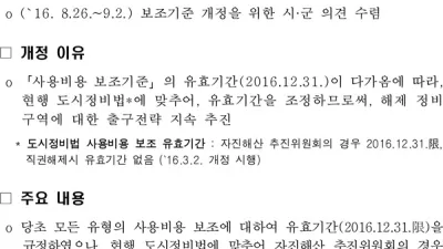 뉴타운 해제지역 매몰비용 내년에도 계속 지원 <주요 내용>○ 경기도, 정비사업 해제지역 매몰비용 계속 지원키로 -‘경기도 도시재정비사업 추진위원회 및 조합 사용비용 보조기준’ 개정 - 자진해산 추진위 제외한 모든 경우에 2017년 이후에도 사용비용 보...