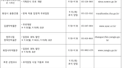추석연휴, 가족나들이 이왕이면 공짜로.... <주요 내용>○ 한복 입으면 화성 융·건릉은 무료입장, 민속촌은 50% 할인○ 수원 화성, 고양문화원, 부천한옥체험마을 등 시군별 체험행사 가득○ 경기도청소년야영장은 16~17일 선착순 무료개방. 7일부터 ...