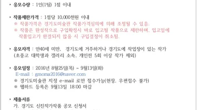 경기도미술관, 신진작가 작품 공모 <주요 내용>○ 경기도-경기도미술관, ‘경기도 신진작가 작품 공모’○ 8월 25일부터 9월 13일까지 접수, 40세 미만 경기도 신진작가 대상 - 평면예술, 입체예술, 미디어아트, 디자인 분야 ○ 심사 후 선정작은 경...