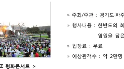 DMZ 프렌즈 3기, DMZ 평화콘서트서 평화와 화합 염원한다 <주요 내용>○ 도, DMZ 프렌즈 광복 71주년 기념 DMZ 평화콘서트 참가 - 오는 14일 오후 7시 30분 파주 임진각 평화누리 공원 ○ 임진각 평화누리 일원 환경정화활동 진행 ○ DM...