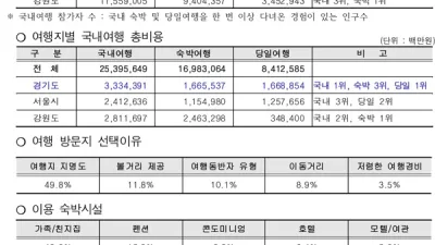 경기도, 5년 연속 한국인이 많이 찾은 관광지 1위 <주요 내용>○ 경기도, 한국문화관광연구원 국민여행 실태조사 분석 결과 발표○ 5년 연속 내국인 관광 방문지 1위 고수(1,545만 명으로 전국 1위) - 국내여행 관광수입 1위, 전년대비 10%증가 ...