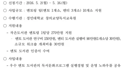 작은도서관 멘토링제도 참가 대상 모집 <주요 내용>○ 경기도, 작은도서관 협력 멘토링 사업 대상 모집 - 멘토 작은도서관에 컨설팅비, 멘티 작은도서관에 실행비 지원 - 5월 2일부터 5월 16일까지 신청 접수, 10개팀(멘티 10개소, 멘토 30개소) 선정...