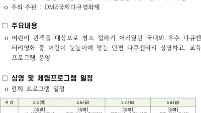 어린이다큐영화제 5~8일까지 파주출판도시에서 열려 <주요 내용>○ 어린이다큐영화제, 5월 5일부터 8일까지 파주출판도시 어린이책잔치에서 열려○ 어린이의 눈높이에 맞춘 다큐멘터리 영화 6편 상영○ 다큐멘터리 영화 상영과 더불어 다양한 체험 프로그램도 진행...