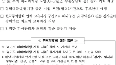 외국어 능통한 청년층, 중소기업 위한 무역전문가로 양성 <주요 내용>○ 道, 5.2.부터 5.23까지「경기청년+4 Trade Manager」교육생 모집○ 청년, 대학생, 외국인 유학생, 다문화인 대상 230여명 규모 6개반 운영○ 운송,통관,결재,관세환...