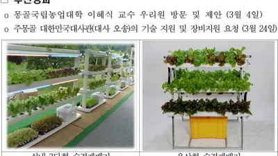 경기도 개발 가정용 채소수경재배기 몽골에 첫 선 <주요 내용>○ 경기도의회 농정해양위원회 몽골 해외연수단『채소 수경재배기』설치 및 전달식 - 4월 28일(목) 17:00 / 주 몽골 대한민국 대사관 경기도가 개발한 가정용 채소 수경재배기가 몽골에 ...