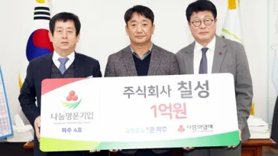 파주시 4번째 나눔명문기업 탄생, ㈜칠성…나눔문화 선도 - 7년 전 화재, 지자체 도움으로 재기 후 지역사회 환원 결심 파주시는 27일 ㈜칠성이 경기 사랑의열매 나눔명문기업에 가입함에 따라 파주시 4호 나눔...
