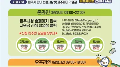 파주시 긴급 에너지 생활안정지원금, 2월 27일부터 신청 가능 - 지급 첫 주는 혼잡을 막기 위해 요일별 5부제 적용 - 김경일 파주시장,“모든 세대가 신속히 지원받을 수 있도록 차질 없이 준비할 것” &nbs...