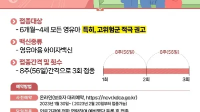 파주시, 영유아 코로나19 예방접종 실시 - 만6개월~4세 영유아...8주(56일) 간격 3차까지 접종 파주시(시장 김경일)는 코로나19 겨울철 재유행 및 신규 변이 바이러스의 지속 출현에 따라 그간 접종 기회가 없었던 영유아(만 ...