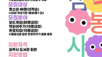 파주시 교하도서관, 청소년 자원봉사단‘心 봉사’40명 모집 - 보드게임·책 읽어주기·지구지킴 분과...7일부터 선착순 접수 파주시 교하도서관(관장 임봉성)은 청소년 자원봉사...