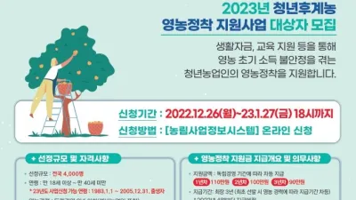 파주시, 청년후계농 지원 대상 오는 27일까지 모집 - 청년들의 안정적 영농 정착 및 농업 분야 진출로 확장 파주시(시장 김경일)가 젊고 잠재력 있는 인재들의 농업 분야 진출로를 넓히고자 ‘청년후계농 영농정착지원 사업&r...