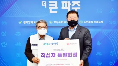 파주시, 2023년 적십자 특별회비 전달...선행 실천 파주시(시장 김경일)는 9일 대한적십자사 경기도지사에 ‘2023년도 적십자 특별회비’를 전달하며 지역사회에 아름다운 선행을 실천했다. &nbs...