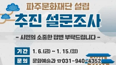 파주시, 문화재단 설립 위한 시민 설문조사 15일까지 진행 - 시민 목소리에 귀 기울이다...설립 추진 본격화 파주시(시장 김경일)는 오는 15일까지 민선8기 공약인 파주문화재단 설립 추진을 위한 시민 설문조사를 실시한...