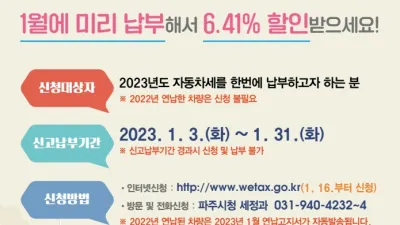 파주시, 오는 31일까지 자동차세 연납 신청...6.4% 할인 - 1월 자동차세 연납하고 선납 할인 받으세요” 파주시(시장 김경일)는 오는 31일까지 2023년 자동차세 연납 신청을 받는다. 자동...