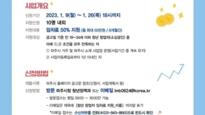 2023-01-09 01:55:58파주시, 26일까지‘청년 창업자 임차료 지원 사업’참여자 모집