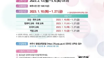 파주시 평생학습관, 2023년 제1기 수강생 1,597명 모집 - 4개 분야 84개 강좌 운영...10일~27일까지 선착순 접수 파주시(시장 김경일)는 1월 10일부터 27일까지 2023년 제1기 파주시 평생학습관 수강...