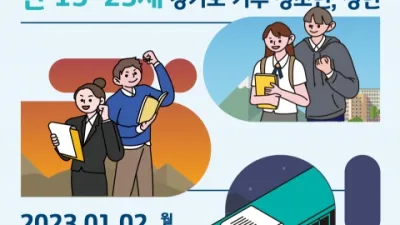 경기도 청소년 교통비 신청, ‘최대 12만 원’ 환급 ○ 경기도 청소년 교통비 지원포털(www.gbuspb.kr), 경기교통공사 콜센터(☎ 1577-8459) - 2023년 2월 15일까지 접수 - 만 13세~23세 주민등록상 거주지가...