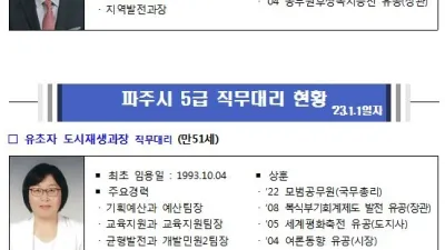 파주시, 2023년 상반기 정기인사 단행 - 민선8기 역점사업 추진 위한 승진 208명 포함, 총 852명 인사배치 완료 파주시는 민선8기 「시민중심 더 큰 파주」를 위한 효율적인 행정운영을 목표로 조직개편...