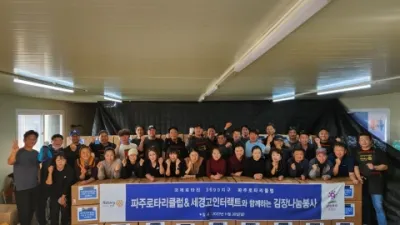 파주읍, 취약계층 50여 가구 방문해 김치 전달 및 안부 살펴 - 파주로타리클럽과 세경고등학교서 김장 담그기 봉사...김치 지원 파주읍(읍장 이재인)은 21일, 기초 생활 수급자와 홀몸 어르신 등 취약계층 50여 가구를 방문해 김치를 전하며 안...