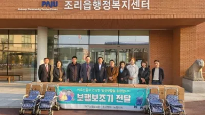 파주시 조리읍, 파주상공회의소 조리읍 지역사회보장협의체에서 노인 보행보조기 기탁 받아 파주시 조리읍(읍장 남명우)은 17일, 파주상공회의소와 조리읍 지역사회보장협의체(행복나눔협의체)에서 노인 보행보조기를 기탁받았다고 밝혔다. 이번 기탁은 취...