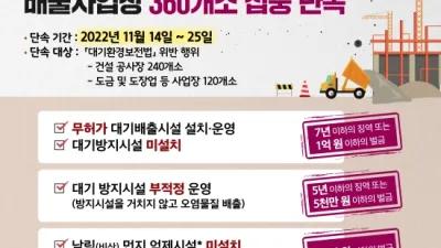 도 특사경, 건설공사장등 미세먼지 다량 배출사업장 집중 단속  ○ 11월 14일부터 25일까지 건설공사장 등 미세먼지 다량 배출사업장 집중 단속 - 중대형 공사장의 비산먼지 발생사업 미신고 및 억제시설 미설치 행위 - 무허가 대기배출시설 설치 및 방지시설 부적...