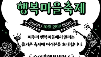 파주읍, 술이홀 행복발전소와 함께 할로윈 축제 개최 - 발표회, 영화 상영 등 주민들이 함께 즐기는 마을 축제 파주읍 할로윈 축제가 28일 오후 6시부터 파주5리 마을회관에서 개최된다. 파주읍 할로윈 축제는 파주5리마을...