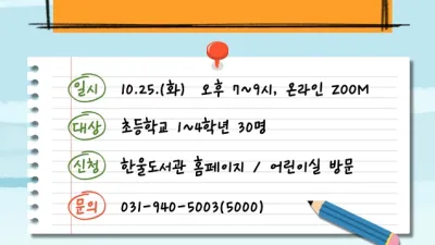 파주시 한울도서관, 박현숙 작가와의 만남 운영 - 10월 5일부터 24일까지, 초등학교 1~4학년 학생 30명 모집 파주시 한울도서관에서는 10월 25일 박현숙 작가와의 만남을 운영한다. 이번 작가와의 만남은 초등학교 어린이자료실에서 진행 중인 &lsquo...