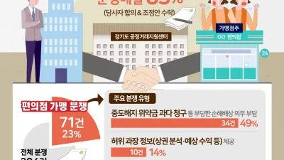 2022-09-28 01:28:24편의점 가맹 분쟁, 경기도 공정거래지원센터에서 해결하세요 경기도, 3년 8개월간 편의점 분쟁 71건 조정. 41건 조정 성립