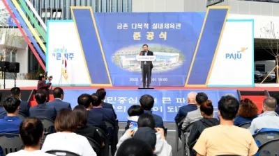 금촌 다목적 실내체육관 준공, 10월 운영 시작 - 지하 1층, 지상 3층에 연면적 7,015㎡ 규모 - 사업비 210억원 투입...수영장‧다목적체육관‧탁구장 등 파주시(시장 김경일)는 28일 파주스타디움 내 금촌 다목적 실내체육관 준공식을 개...