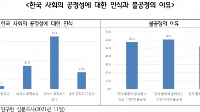 2022-09-30 00:46:39수도권 주민의 72.7%, 한국 사회가 공정하지 않다고 생각해… 기회 및 과정의 불공정이 결과의 불공정보다 더 심각하다고 인식