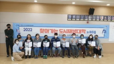 파주시, 찾아가는 도시재생대학 in 파주읍 수료식 개최 - 주민참여기반 구축 및 사업콘텐츠 발굴...15명 수료생 배출 파주시(시장 김경일)는 지난 20일 ‘2022 찾아가는 도시재생대학 in 파주읍’의 수료식을 갖고 수강생 15명에게 수료증을 수...