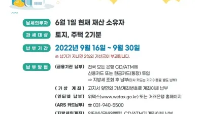 파주시, 9월 정기분 재산세 873억 원 부과 파주시(시장 김경일)는 주택 2기분과 토지분 과세대상 19만여 건에 대해 2022년 9월 정기분 재산세 873억 원을 부과·고지했다. 재산세는 보유기간과 관계없이 매년 과세기준일인 6월 1일 소유자...