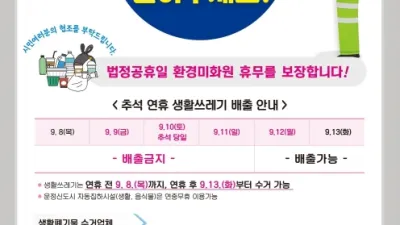 파주시, “추석 연휴 쓰레기 수거도 쉽니다” 파주시(시장 김경일)는 환경미화원 휴무 보장을 위해 추석 연휴 기간(9.9.~9.12.)에는 생활 쓰레기를 수거하지 않는다. 시민들은 연휴 전날인 9월 8일부터 11일까지 생활폐기물을 배출해...