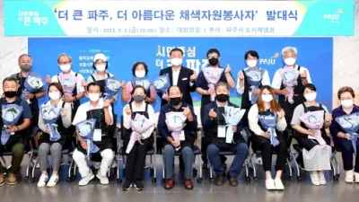 2022년 파주시 채색자원봉사자 발대식 개최 - 더 큰 파주, 더 아름다운 채색자원봉사자 활동 기대 파주시(시장 김경일)는 2일 파주시청 대회의실에서 2022년 파주시 채색자원봉사자 발대식을 개최했다. 이날 발대식에는 김경일 파주시장, 채색자원봉사자, 관계...