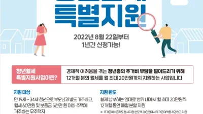 파주시, 청년 월세 한시 특별지원 사업 신청 접수 - 최대 월 20만원 1년간 지원 파주시(시장 김경일)는 오는 22일부터 코로나19 장기화로 경제적 어려움을 겪는 청년층의 주거비 부담 경감을 위해 청년 월세 한시 특별지원 사업 신청을 받는다고 밝혔다. 지...