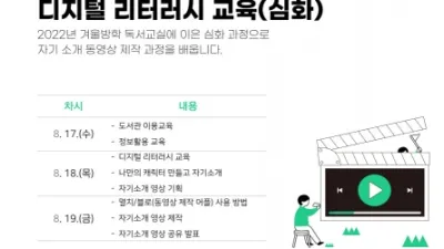 파주시 탄현도서관, 어린이 독서교실 운영 - 너를 보여 줘:디지털 리터러시 교육 파주시 탄현도서관은 오는 17일부터 19일까지 2022년 여름방학 어린이 독서교실 ‘너를 보여 줘:디지털 리터러시 교육’을 운영한다고 밝혔다. 지난 1월에...