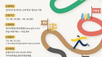 경기도-도평진원, 8월 30일까지 민주주의 역사현장 체험 참여자 모집 경기도와 경기도평생교육진흥원이 8월 18일부터 30일까지 온라인 콘텐츠와 체험 꾸러미를 활용해 민주주의 가치·의미를 되새겨보는 ‘민주주의 역사현장 체험’의 참여자 1...