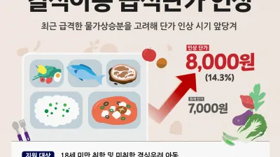 경기도, 결식아동 급식단가 7천원➝8천원(14.3%) 인상. 김동연 지사, “물가상승분 고려해 인상 시점 앞당기라” 지시 급격히 오르는 물가에 맞춰 급식 지원단가를 높여야 한다는 지적이 사회 곳곳에서 제기되는 가운데 경기도...