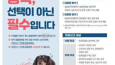 파주시, 반려동물 자진신고 기간 운영 파주시(시장 김경일)는 반려동물을 등록하지 않은 시민들의 자발적 참여를 유도하기 위해 오는 8월 31일까지 동물등록 자진신고 기간을 운영한다고 밝혔다. 동물등록제는 동물 보호와 유실·유기 방지 등을 위해 반...