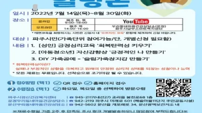 2022-07-18 02:02:32파주시, 힐링존 참가자 모집…‘화합․친목 다진다’
