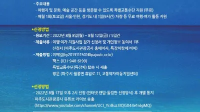 파주도시관광공사, 교통약자 여행·여가 활동 지원사업 시범 운영 - 교통약자의 이동권 보장과 사회참여 확대를 위해 편의 서비스 지원 파주시 교통약자이동지원센터에서는 다음달 8일부터 교통약자를 대상으로 여행&m...