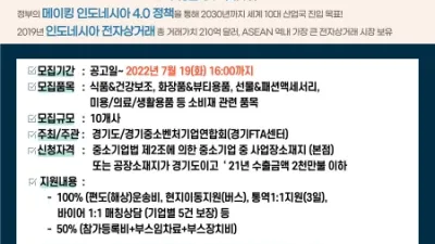 2022-07-04 01:42:09경기도, ‘자카르타 국제 프리미엄 소비재전’ 참가기업 모집‥세계 4위 인구 대국 공략