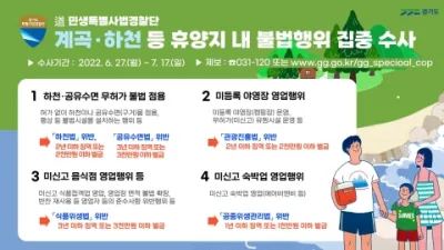 철거한 계곡 평상. 다시 설치하는 일 없도록 경기도 특사경, 계곡·하천 등 휴양지 불법행위 집중 수사 경기도 특별사법경찰단이 6월 27일부터 7월 17일까지 여름휴가철을 맞아 도내 하천‧계곡 등 유명 휴양지의 불법행위를 집중 수사한다. 수사 대상은 가평 유...