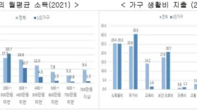 경기도 1인 가구 셋 중 하나는 월평균 소득 100만 원 미만 도, 1인 가구 관련 통계 올해 처음으로 총정리 지난해 경기도 1인 가구의 셋 중 하나는 월평균 소득이 100만 원 미만이라는 조사 결과가 나왔다. 연령대는 30대가 가장 많았으며, 생활비는 주거와 식료품,...