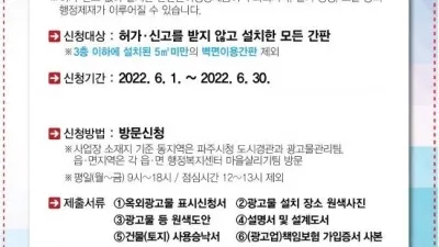 파주시, 불법광고물 한시적 양성화 추진 - 6월 1일부터 30일까지 진행 파주시는 6월 1일부터 30일까지 관련법을 인지하지 못해 미신고(허가) 된 불법광고물에 대해 한시적 양성화를 추진한다고 밝혔다. 이번 불법광고물 한시적 양성화는 불법 옥외광고물의 소유...