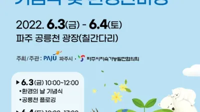 파주시, 제27회 환경의 날 기념행사 추진 파주시는 환경의 날(6월 5일)을 맞아 환경보전에 대한 시민참여와 공감대 확산을 위해 파주시지속가능발전협의회와 함께 오는 6월 3일부터 4일까지 공릉천 광장에서 ‘제27회 환경의 날 기념행사’를 추진한다고...