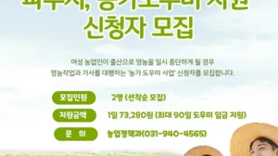 파주시, 출산 농·어업인을 돕는 농가도우미 지원 신청자 모집 파주시는 여성 농업인이 출산으로 영농을 일시 중단하게 될 경우 영농작업과 가사를 대행하는 ‘농가 도우미 지원 사업’ 신청자 2명을 모집한다고 밝혔다. 농&midd...