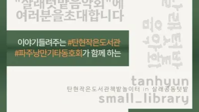 파주시 탄현작은도서관 살래공동텃밭 음악회’개최 - 도서관 이용층 다양화 기대 - 파주시 탄현작은도서관은 오는 14일 탄현면 성동사거리 인근 살래공동텃밭에서 ‘살래공동텃밭 음악회’를 개최한다고 밝혔다....
