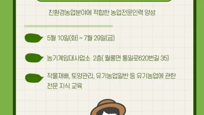 파주시, 유기농업기능사 자격증 취득반 운영 파주시는 친환경농업분야에 적합한 농업전문인력 육성을 위해 「유기농업기능사 자격증 취득반」을 운영한다고 밝혔다. 이번 교육은 유기농업기능사 자격증 취득을 위한 필기 및 실기 대비 교육 과정으...